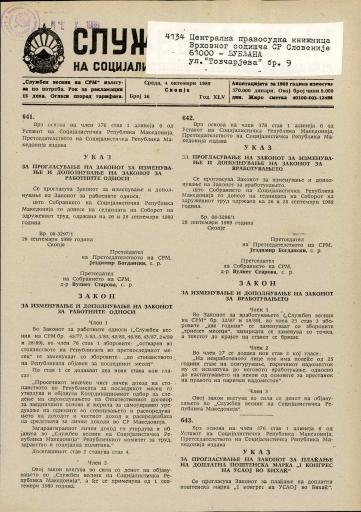 Založnik(i):Novinsko-izdavačka rabotna organizacija Službeni vesnik na SRM, Skopje