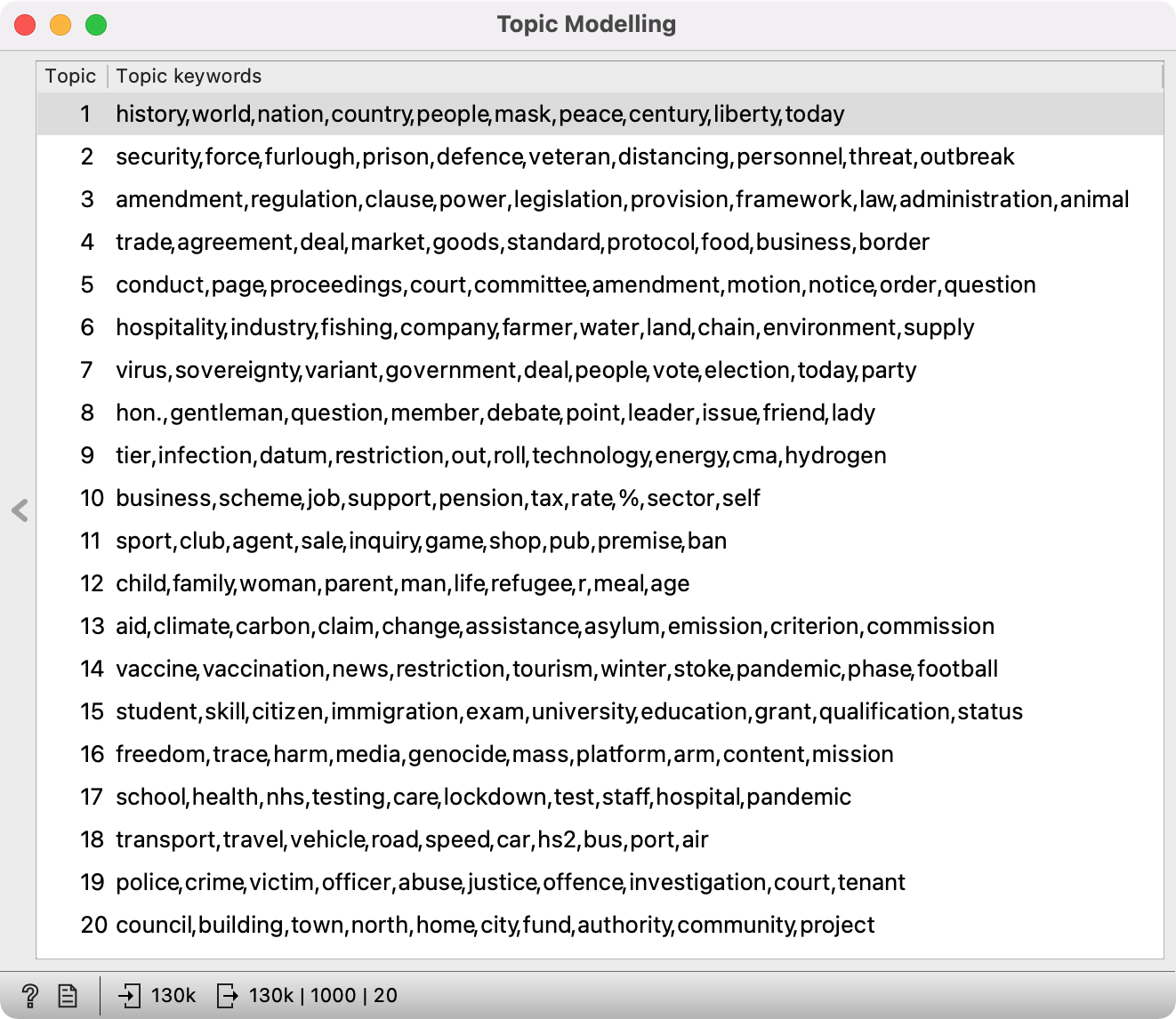 V tem učnem gradivu bomo analizirali zapise parlamentarnih debat ParlaMint, pri čemer bomo uporabili napredne avtomatske analitične tehnike oz. točneje tematsko modeliranje. Namen učnega gradiva je raziskovalke in raziskovalce s področja humanistike in družboslovja vpeljati v svet rudarjenja besedil ter prikazati vrednost tovrstnih pristopov za družboslovne in humanistične raziskave. Učno gradivo razlaga posebnosti parlamentarnega diskurza in uporabo tematskega modeliranja za reševanje konkretnih raziskovalnih vprašanj.