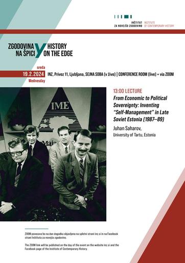 To predavanje obravnava možnost konceptualnih inovacij v avtoritarnih enostrankarskih režimih. Kakšne izraze in pojme je mogoče uporabiti za doseganje političnih sprememb v trenutkih, ko je pritisk režima popustil, a je na voljo le omejeno število ideoloških jezikov? Projekt teritorialnega samoupravljanja (program IME), ki so ga septembra 1987 predlagali štirje estonski znanstveniki (na fotografiji), je temeljil na ideji, da bi morala sovjetska republika kot teritorialna enota delovati kot neodvisno podjetje. V enem letu je ta ideja mobilizirala narod in sčasoma preusmerila fokus z ekonomske na politično suverenost, kar je sprožilo vrsto deklaracij o suverenosti po vsej Sovjetski zvezi. Predavanje za konec opisuje, kako so se vodje projekta IME skušali učiti iz izkušenj vzhodne in srednje Evrope, skupaj s Slovenijo. Njihov prvi obisk v Ljubljani (1989) je imel za cilj učenje iz jugoslovanskega federalističnega modela, drugi obisk, v letu 1990, pa grajenje sodelovanja med političnimi silami, ki so si prizadevale za samostojnost.