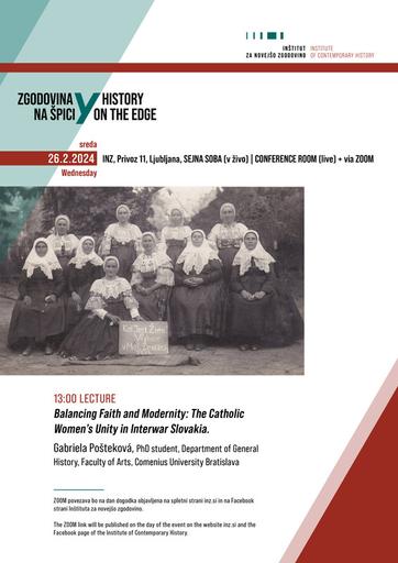 Predavanje preučuje nastanek in razvoj Enotnosti katoliških žensk na Slovaškem v medvojnem času. Gre za ključno organizacijo, ki je na novo opredelila vloge žensk skozi prizmo krščanskega feminizma. Od volilne pravice žensk leta 1918 se je slovaška družba soočila s preobrazbo političnega in družbenega okolja, kar je konservativna katoliška gibanja spodbudilo k prilagoditvi svojih strategij. Enotnost katoliških žensk je skušala uravnotežiti sodobnost s tradicijo, pri čemer je poudarjala komplementarnost moških in žensk, medtem ko je branila družino in vero pred domnevnimi grožnjami sekularnega feminizma, socializma in komunizma. S preučevanjem takšnega niansiranega stališča do feminizma, vlog spolov in javnega udejstvovanja predavanje ponuja vpogled v prepletanje med vero, politiko in razvijajočim se konceptom ženskosti v spreminjajočem se svetu.