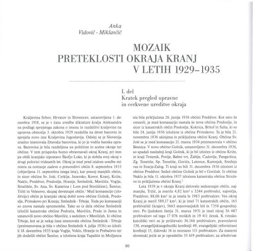 Kraljevina Srbov, Hrvatov in Slovencev, ustanovljena 1. decembra 1918, se je v času uvedbe diktature kralja Aleksandra na podlagi sprejetega zakona o imenu in razdelitvi kraljevine na upravna območja 3. oktobra 1929 razdelila na devet banovin in sprejela novo ime Kraljevina Jugoslavija. Odslej se je Slovenija uradno imenovala Dravska banovina, ki jo je vodila banska uprava. Banovina je bila razdeljena na politične in sodne okraje ter občine. V tem prispevku bomo obravnavali okraj Kranj, pri tem pa obšli kranjsko izpostavo Škofjo Loko, ki je dobila svoj okraj v drugi polovici tridesetih let. Okraj je imel pred izidom uredbe ministra za notranje zadeve o preureditvi občin 8. septembra 1933 (objavljena 11. septembra istega leta), kar precej manjših občin, in sicer občine Sv. Jošt, Cerklje, Jezersko, Kovor, Kranj, Križe, Naklo, Preddvor, Predoslje, Hrastje, Smlednik, Mavčiče, Voglje, Stražišče, Sv. Ana, Sv. Katarina ( Lom pod Storžičem), Šenčur, Tržič in Velesovo, skupaj devetnajst občin. Med komasacijo (zložitvijo) občin je kranjski okraj dobil nove občine Golnik, Predoslje, Primskovo pri Kranju, Smlednik - Trboje. Toda po komasaciji so znova nastale spremembe. Tako so iz dela občine Smlednik izločili katastrske občine Podreča, Mavčiče, Praše in Jama in ustanovili novo občino Mavčiče, s sedežem v Mavčičah. Iz občine Trboje, kot se je nekaj časa imenovala občina Smlednik - Trboje (preimenovana je bila v občino Smlednik 4. julija 1936) so izločili 18. decembra 1935 kraje Voglje, Voklo, Hrastje in Prebačevo ter jih dodelili občini Šenčur, a izločena kraja Tupaliče in Možjanca sta bila priključena 26. junija 1936 občini Preddvor. Kot smo že omenili, je med komasacijo nastala še nova občina Predoslje, in sicer iz katastrskih občin Predoslje, Kokrica, Britof in Suha, ki so bile 24. junija 1936 izločene iz občine Primskovo. Ta je bila 21. novembra 1936 ukinjena in priključena občini Kranj. Občina Sv. Jošt se je med komasacijo 21. marca 1934 preimenovala v občino Besnica. V novo občino Golnik, ustanovljeno 31. decembra 1936, so spadali naslednji kraji Golnik, ki je bil izločen iz občine Križe, in kraji Trstenik, Povlje, Babni vrt, Žablje, Čadovlje, Pangeršica, Zg. Tenetiše, Sp. Tenetiše, Goriče, Letence, Kamnjek, Srednja vas in Svarje-Zalog. Ti kraji so bili 31. decembra 1936 izločeni iz občine Preddvor. Sedež občine Golnik je bil v Goričah. Iz občine Naklo je bila 11. oktobra 1937 izločena katastrska občina Struževo in priključena občini Kranj.