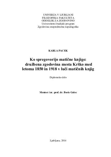 Pričujoče diplomsko delo podaja družbeno zgodovino mesta Krško med letoma 1850 in v luči analize rojstnih, poročnih in mrliških matičnih knjig. Razčlenjena analiza krstov otrok vpisanih v rojstne matične knjige omogoča vpogled v socialni, narodni, poklicni, demografski in gospodarski položaj mestnega prebivalstva v omenjenem obdobju. V vlogi vpisovalcev v matične knjige mesta Krško praviloma najdemo mestnega vikarja, po letu 4, ko je bil krški vikariat povzdignjen v župnijo, pa župnijskega upravitelja oz. župnika. Najprej so le izjemoma, po letu pa vse pogosteje, zakramente podeljevali patri kapucini. Število vpisov v matrike s strani kapucinov se je povečevalo z daljšanjem prehodnega obdobja med odhodom enega in prihodom drugega vikarja oz. župnika v Krško. V matičnih knjigah mesta Krško se med vpisi v nemškem jeziku in pisavi gotici od leta 1865 naprej pojavljajo posamezni primeri priimkov vpisani v slovenščini in prehodni obliki pisave med gotico in gajico, od vključno leta 1900 pa so vsi vpisi v slovenskem jeziku in gajici. To se je zgodilo kasneje, kot je bilo običajno po župnijah ljubljanske in lavantinske škofije, kjer je do spremembe jezika in pisave matičnih knjig v prid slovenščini in gajici prišlo že v drugi polovici 19. stoletja. V Krškem se je v obdobju 1850–1918 rodilo 1.412 otrok, od tega 1 % več deklic kot dečkov, kar je v nasprotju z župnijami, ki smo jih vzeli za primerjavo (Ig, Trnovo, Preloka in Celje), kjer je na svet prišlo malo več dečkov kot deklic. Povečano število rojstev je moč zaslediti v jesenskem in zimskem času, z izjemo decembra, njihovo zmanjšamo število pa spomladi in poleti, z izjemo avgusta. Ti podatki sovpadajo s trendi naraščanja in upadanja števila rojstev po župnijah, ki smo jih vzeli za primerjavo s Krškim. Enake ugotovitve veljajo za spočetja otrok, vendar v drugem časovnem obdobju, saj je porastu spočetij značilen za prvo polovico leta, z izjemo aprila, upad pa za drugo polovico, z izjemo v novembru. Posebnost Krškega v primerjavi z omenjenimi župnijami je, da je v obdobju 1880– število rojstev upadalo. Ta pojav je bil odraz krize mestnega gospodarstva, ki je bila pogojena z odsotnostjo neposredne železniške povezave, preusmeritvijo prometa in trgovine na sosednji štajerski Videm, propadom splavarstva in od njega odvisnih obrti ter odsotnostjo industrijskih obratov, izgradnjo katerih je oviralo pomanjkanje prostora med Trško goro in Savo. Zaradi navedenih vzrokov Krško ni bilo cilj velikega priseljevanja, število rojstev pa je posledično začelo upadati. Ugotovitev, da je Krško v zadnjih desetletjih . stoletja v gospodarskem pogledu nazadovalo, temelji na poklicni analizi očetov, ki je razodela, da je imelo mestno prebivalstvo predvsem uradniški in obrtniški, precej manj pa trgovski in kmečki značaj. Na to, da je Krško v drugi polovici . stoletja naprej prizadelo postopno obubožanje, kaže rast števila pripadnikov kmečkega in podkmečkega sloja znotraj mestnega prebivalstva, zmanjšano število obrtnikov in pojav posameznih novih obrtniških poklicev pa pričuje, da je v zadnjih dveh obravnavanih obdobjih analize splošen gospodarski razvoj na osnovi industrializacije zajel Krško le v manjšem obsegu in šele v začetku 2 . stoletja. Izkazalo se je, da je razvoj mesta temeljil predvsem na delovanju številnih državnih inštitucij ter rasti števila in raznovrstnosti z njimi povezanih poklicev. Analiza krstnih matičnih knjig je razkrila, da je v sredini . stoletja bila večina otrok še krščenih na dan rojstva ali prvi dan po njem, v zadnjem obdobju naše analize pa je bila že več kot polovica otrok krščena od sedmega dneva rojstva naprej. S poklicno analizo staršev, ki so svoje otroke nesli h krstu po prvem dnevu rojstva, smo ugotovili, da so bili nosilci spreminjanja krstnih navad bolj premožni in izobraženi meščani. Iz desetletja v desetletje se je ta skupina povečala in postopoma zajela tudi preostali del mestnega prebivalstva.V obdobju naše analize so imena prejeli vsi otroci, z izjemo mrtvorojenih in krščenih v sili. Pri poimenovanju se je oblikoval nabor moških in ženskih imen, ki je bil pri dečkih malo večji kot pri deklicah. Pri dečkih sta bili najbolj priljubljeni imeni Jožef in Franc, pri deklicah pa Marija, medtem ko se je seznam pogostejših imen iz desetletja v desetletje spreminjal. Tri četrtine otrok je prejelo eno ime, malo manj kot četrtina dve imeni, 5 % otrok je prejelo tri imena in manj kot 1 % več kot tri imena. Primerjava z zgoraj omenjenimi župnijami razodeva, da je bilo poimenovanje z več imeni pogostejše v mestnem okolju kot pa na podeželju. Poimenovanje z več kot enim imenom se je izkazalo za bolj priljubljeno pri deklicah. Gledano v celoti je eno ime prejelo več kot polovica otrok očetov iz vseh poklicnih razredov, z izjemo zadnjega obravnavanega obdobja, ko je to storila le še večina očetov, ki so se preživljali z delom na zemlji ali pa v gozdu. Otroke so z dvema imenoma v največjem številu poimenovali posestniki in zaposleni v državnih inštitucijah. Starši so za krstne botre naprošali sorodnike in prijatelje ali pa le-te izbirali glede na poklicno sorodnost in pri tem težili, da bi krstni botri bili vsaj statusno enaki, če že ne bolje situiran od družine krščenca. Starši so najprej izbirali po dva krstna botra, ki sta bila ali zakonski ali pa poljubno izbran par, od 90. let 19. stoletja naprej pa samo enega botra, kar je postalo ob koncu analize prevladujoča izbira. Nekateri krstni botri so bili bolj priljubljeni in tako za to vlogo velikokrat naprošeni. Toda nabor botrov z več krščenci se je iz desetletja v desetletje krčil, povečeval pa nabor botrov, ki so imeli malo ali pa samo enega krščenca. Na podlagi podpisov krstnih botrov v originalni rojstni matični knjigi se je izkazalo, da je bilo v letih 1850–1867 pismenih tri četrtine krstnih botrov. Posebne obravnave so bile
