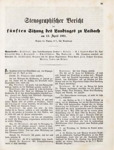• Originalni naslov: Stenographischer Bericht der fünften Sitzung des Landtages zu Laibach am 13. April 1861