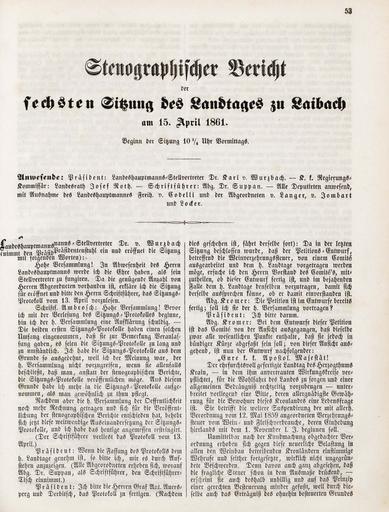 • Stenographischer Bericht der sechster Sitzung des Landtages zu Laibach am 15. April 1861