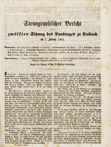 • Stenographischer Bericht der zwölften Sitzung des Landtages zu Laibach am 7. Februar 1863