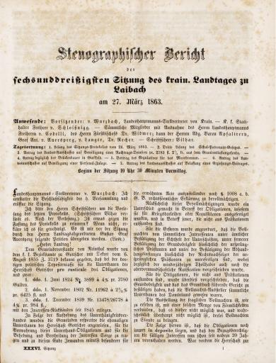 • Stenographischer Bericht der sechsunddreissigsten Sitzung des Landtages zu Laibach am 27. März 1863
