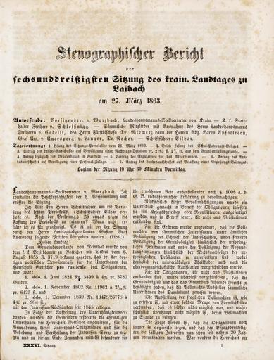 • Original title: Stenographischer Bericht der sechsunddreissigsten Sitzung des Landtages zu Laibach am 27. März 1863