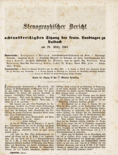 • Stenographischer Bericht der achtunddreissigsten Sitzung des Landtages zu Laibach am 29. März 1863