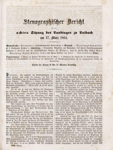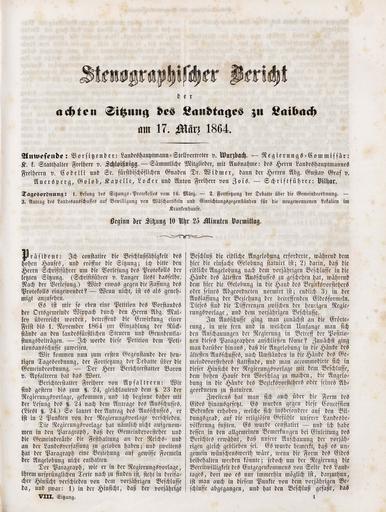Original title: Stenographischer Bericht der achten Sitzung des Landtages zu Laibach am 17. März 1864