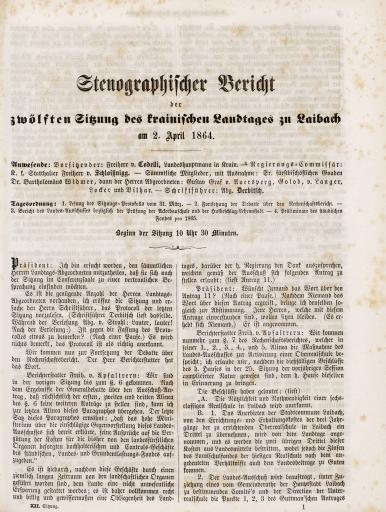 • Originalni naslov: Stenographischer Bericht der zwölften Sitzung des Landtages zu Laibach am 2. April 1864