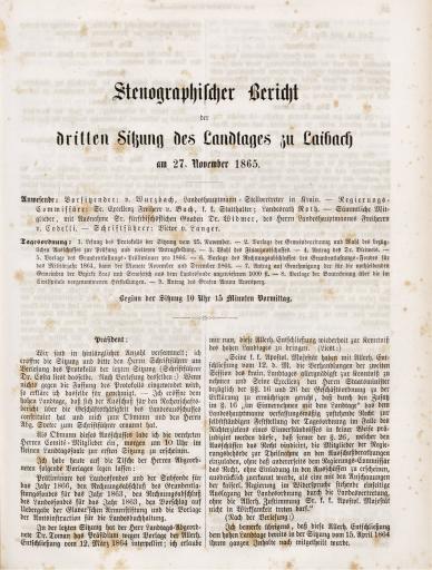 • Originalni naslov: Stenographischer Bericht der dritten Sitzung des Landtages zu Laibach am 27. November 1865