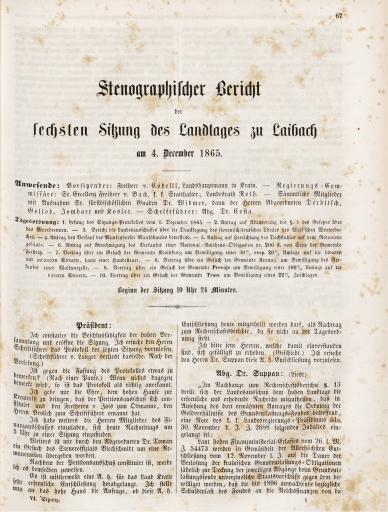 Originalni naslov: Stenographischer Bericht der sechsten Sitzung des Landtages zu Laibach am 4. Dezember 1865