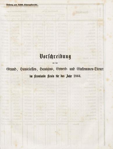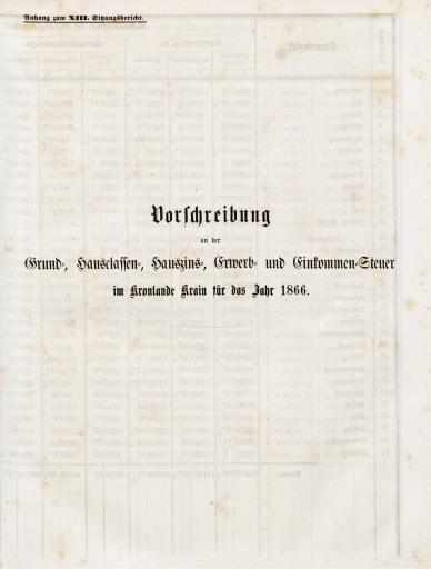 Originalni naslov: Vorschreibung an der Grund-, Hansclassen-, Hauszins-, Erwerb- und Einkommensteuer im Kronlande Krain in das Jahr 1866