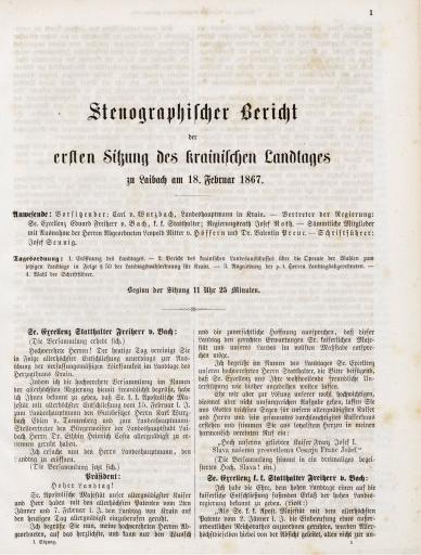 Original title: Stenographischer Bericht der ersten Sitzung des krainischen Landtages zu Laibach am 18. Februar 1867