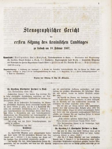 • Original title: Stenographischer Bericht der ersten Sitzung des krainischen Landtages zu Laibach am 18. Februar 1867