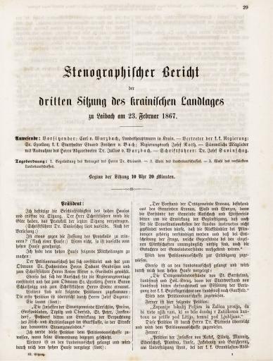 Originalni naslov: Stenographischer Bericht der dritten Sitzung des krainischen Landtages zu Laibach am 23. Februar 1867