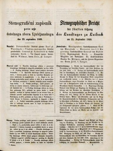 Originalni naslov: Stenografični zapisnik pete seje deželnega zbora Ljubljanskega dne 22. septembra 1869. leta / Stenographischer Bericht der fünften Sitzung des Landtages zu Laibach am 22. September 1869