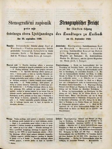 Original title: Stenografični zapisnik pete seje deželnega zbora Ljubljanskega dne 22. septembra 1869. leta / Stenographischer Bericht der fünften Sitzung des Landtages zu Laibach am 22. September 1869