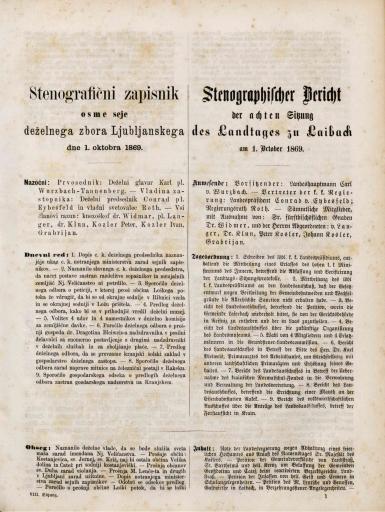 Original title: Stenografični zapisnik osme seje deželnega zbora Ljubljanskega dne 1. oktobra 1869. leta / Stenographischer Bericht der achten Sitzung des Landtages zu Laibach am 1. Oktober 1869