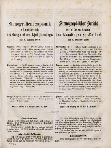 Original title: Stenografični zapisnik enajste seje deželnega zbora Ljubljanskega dne 8. oktobra 1869. leta / Stenographischer Bericht der elften Sitzung des Landtages zu Laibach am 8. Oktober 1869