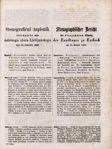 Original title: Stenografični zapisnik štirinajste seje deželnega zbora Ljubljanskega dne 15. oktobra 1869. leta / Stenographischer Bericht der vierzehnten Sitzung des Landtages zu Laibach am 15. Oktober 1869