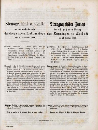 Originalni naslov: Stenografični zapisnik osemnajste seje deželnega zbora Ljubljanskega dne 21. oktobra 1869. leta / Stenographischer Bericht der achzehnten Sitzung des Landtages zu Laibach am 21. Oktober 1869