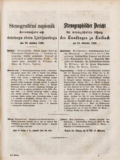 Original title: Stenografični zapisnik devetnajste seje deželnega zbora Ljubljanskega dne 22. oktobra 1869. leta / Stenographischer Bericht der neunzehnten Sitzung des Landtages zu Laibach am 22. Oktober 1869