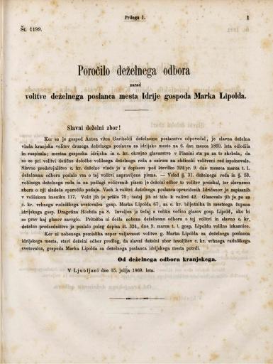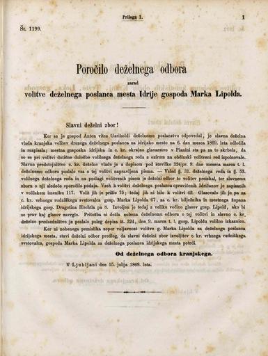 Priloga 1-10 (Poročilo deželnega odbora zarad volitve deželnega poslanca mesta Idrije gospoda Marka Lipolda, Poročilo deželnega odbora zarad volitve deželnega poslanca okolice ljubljanske in Vrhnike, gospoda Franceta Kottnika, Poročilo deželnega odbora zarad podaljševanja sedanje milošnje za Albino in Hermino Skedlovo, Poročilo deželnega odbora zarad privolitve 70% in 65% priklada, za prezidanje cerkovniške hiše v šolo in v učiteljevo stanovališče na Studencu, Predlog deželnega odbora o gozdnarjih za vojvodino Kranjsko, Predlog deželnega odbora zarad vdinjanja še enega služabnika na ljubljanski realki, Predlog deželnega odbora o gozdnarjih za vojvodino kranjsko, Predlog deželnega odbora zarad vdinjanja še enega služabnika na ljubljanski realki, Voranschlag des krainischen Grundentlastungsfondes ro 1870, Bericht des Landesausschusses über den Rechnungsabschluss des krainischen Grundentlastungsfondes pro 1868)