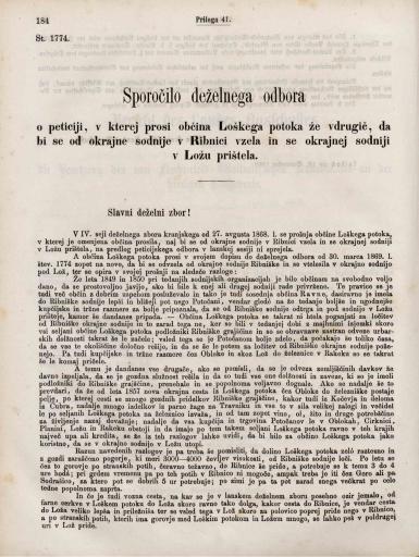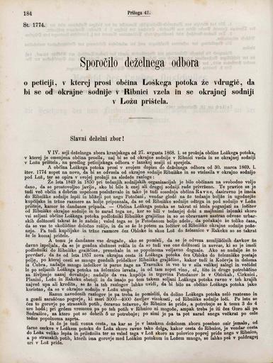 Priloga 41-50 (Sporočilo deželnega odbora o peticiji, v kterej prosi občina Loškega potoka že vdrugič, da bi se od okrajne sodnije v Ribnici vzela in se okrajnej sodniji v Ložu prištela, Poročilo deželnega odbora o prošnji gospoda dr. Dragotina Bleiweisa, nadzdravnika v posilni delalnici za enomerno postavljenje z drugimi ndzdravniki v deželnih službah in za zboljšanje plače, Predlog deželnega odbora zarad naprave mitnice na železnični postaji v Rakeku, Sporočilo finančnega odseka o sklepu računa zaklada zemljiščinega odškodovanja za leto 1868, Sporočilo finančnega odseka o proračunu zaklada za zidanje deželne norišnice kranjske za leto 1870, Bericht des Landesausschusses über die zukünftige Organisirung des Museums, Bericht des Landesausschusses in Betreff der Übernahme des krain. Normalschulfondes in die Verwahrung und Vervaltung der Landesvertretung, Schreiben des löblichen k. k. Landespräsidiums enthaltend die Mittheilung eines Erlasses des hohen k. k. Ministeriums des Innern betreffend die Abfassung und Verifizirung der Landtagssitzungsprotokolle, Mittheilung des k. k. löblichen Landespräsidiums an dem Landesausschuss, dass der Gesetzentwurf wegen Vertheilung der Gemeindehutweidem und Wechselgründe, die Allerhöchste Sanktion nicht erhalten habe, Regierungsvorlage (Gesetz))