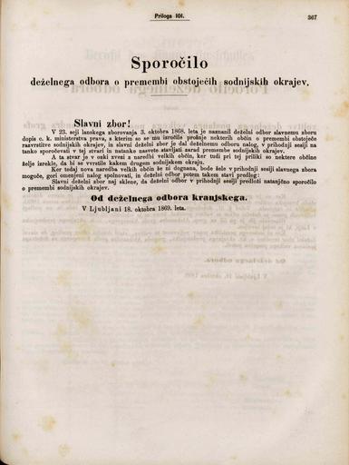 Priloga 101-110 (Sporočilo deželnega odbora o premembi obstoječih sodnijskih okrajev, Poročilo deželnega odbora zarad volitve deželnega poslanca velkega posestva Aleksandra grofa Auersperga, Bericht des Finanzausschusses über den Voranschlag des krainischen Landesfondes mit Rücksicht auf dessen Subfonde für das Jahr 1870, Bericht des Landesausschusses betreffend das Einschreiten der Stadtgemeinde Laibach um die Genehmigung zum Verkaufe mehrerer Grundstücke, Sporočilo deželnega odbora zarad vpeljave nauka za modelovanje na tukajšni c. kr. viši realki, Poročilo odbora za dr. Bleiweisov predlog naj se pregledajo splošnje državne postave, Sporočilo ustavnega odseka zarad predloga poslanca dr. V. Zarnika za vpeljavo slovenskega jezika pri deželnih uradnijah, Sporočilo ustavnega odseka zarad predloga poslanca g. dr. V. Zarnika za stalno preustrojenje ljubljanske bolnice, Schreiben des löblichen k. k. Landespräsidiums, betreffend die Übergabe in die Verwahrung und Verwaktung der Landesvertretung der Freiherr v. Gallenfels'schen, Schellenberg'schen, v. Lerch'schen, und v. Weitenhiller'schen Fräulein und Mädchenbeteiligungsstiftungen, dann der Freiherr Flödnigg'schen und illir. Blindenstiftung, der Holdheim'schen Taubstummenstiftung, und in Betreff der Johann Kalister'schen Gemeindebetheiligungsstiftung, Poročilo ustavnega odseka zastran rabe jezika v vseh c. kr. uradnijah na Kranjskem)