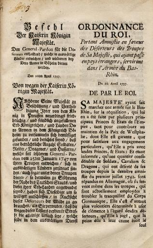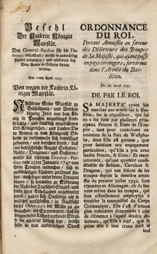 • General-Pardon für die Deserteurs enthaltend, welche in auswärtige Länder entwichen und wiederum bey Dero Armee in Böheim dienen werden.