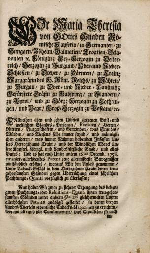 Zbirka raznih patentov, odlokov, predpisov, norm, navodil, okrožnic ipd., ki so jih izdali Karl VI., Marija Terezija in Jožef II.