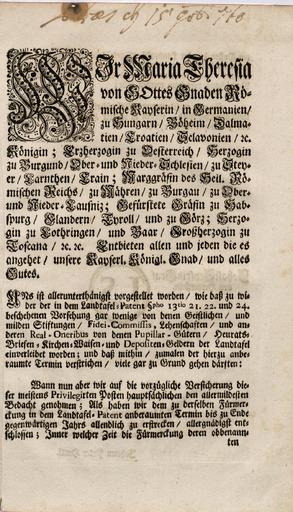 Zbirka raznih patentov, odlokov, predpisov, norm, navodil, okrožnic ipd., ki so jih izdali Karl VI., Marija Terezija in Jožef II.