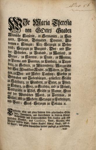 Zbirka raznih patentov, odlokov, predpisov, norm, navodil, okrožnic ipd., ki so jih izdali Karl VI., Marija Terezija in Jožef II.