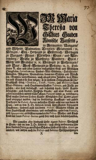 Zbirka raznih patentov, odlokov, predpisov, norm, navodil, okrožnic ipd., ki so jih izdali Karl VI., Marija Terezija in Jožef II.