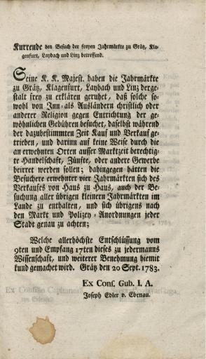 • Kurrende den Besuch der freyen Jahrmärkte zu Grätz, Klagenfurt, Laybach und Linz betrreffend.
