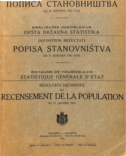 • Kraljevina Jugoslavija. Opšta državna statistika. Definitivni rezultati popisa stanovništva od 31 januara 1921 god.