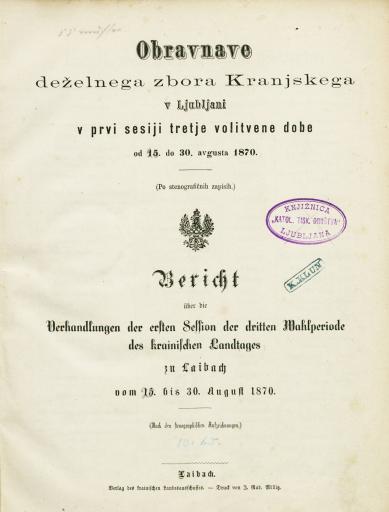 Original title: Obravnave deželnega zbora Kranjskega v Ljubljani v prvi sesiji tretje volitvene dobe od 15. do 30. avgusta 1870. Obravnave deželnega zbora Kranjskega v Ljubljani v drugi sesiji tretje volitvene dobe od 14. septembra do 14. oktobra 1871.
