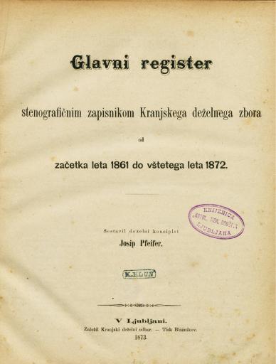 • Originalni naslov: Glavni register stenografičnim zapisnikom Kranjskega deželnega zbora od začetka leta 1861 do vštetega leta 1872.