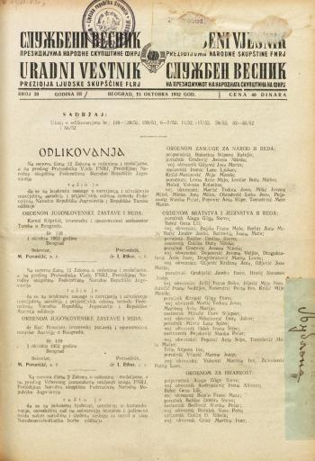 - Службени весник Президијума Народне скупштине ФНРЈ, 1952, бр. 20