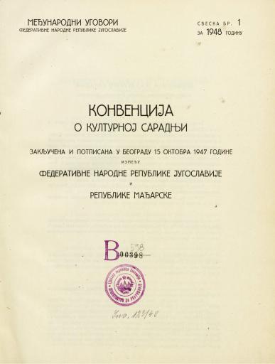 - Конвенција о културној сарадњи између Федеративне народне републике Југославије и Републике Мађарске