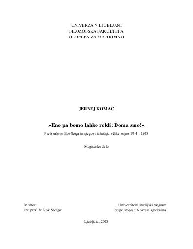 Magistrsko delo obravnava izkušnjo vélike vojne (1914-1918) prebivalstva na Bovškem, tj. območju današnje Občine Bovec oz. takratnega sodnega okraja Bovec v deželi Goriški-Gradi-ški. Avtor s pomočjo arhivskih virov, dnevnikov, spominov, intervjujev, časopisja ter z uporabo relevantne strokovne literature in člankov obravnava različne tematike znotraj izkušnje vélike vojne, od začetka vojne leta 1914 do konca vojne leta 1918 in prvih povojnih let. V raziskavi avtor predstavi kompleksnost vojne izkušnje, ki jo je doživelo prebivalstvo na Bovškem. Tematike, ki so v delu obravnavane obsegajo najprej dogajanje v prvem letu vojne, zatem pa različne izkušnje prebivalstva po nastopu vojne med Avstro-Ogrsko in Italijo, ki obsegajo begunstvo v Avstro-Ogr-ski in Italiji, življenje prebivalstva v zaledju, problematiko preskrbe, delovnih mest, duhovne oskrbe prebivalstva, šolanja, idr. V končnem obdobju vojne se avtor posveti vračanju prebivalstva iz begunstva v letih 1918 in 1919 ter predvsem težavam, ki so vračajoče begunce spremljale ob nastanitvi v domačih krajih, saj so bili ti močno prizadeti zaradi potekajočih bojev med leti 1915 in 1917. Čeprav se je vélika vojna leta 1918 uradno zaključila, se je prebivalstvo krajev ob nekdanji fronti še leta soočalo z njenimi posledicami.