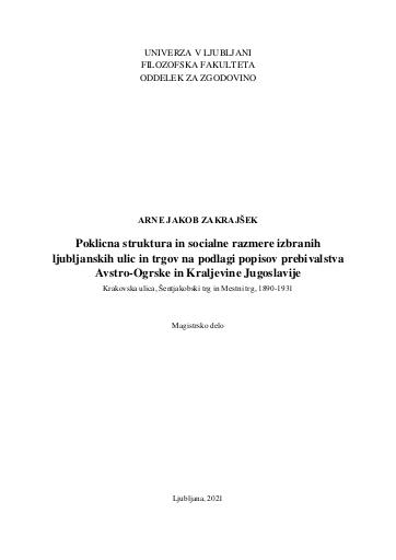 Poklicna struktura in socialne razmere izbranih ljubljanskih ulic in trgov na podlagi popisov prebivalstva Avstro-Ogrske in Kraljevine Jugoslavije: Krakovska ulica, Šentjakobski trg in Mestni trg, 1890-1931 19. stoletje je bilo obdobje, ko je za sodobno državo na pomenu začela pridobivati uradna statistika, eno od njenih ključnih orodij pa je bil popis prebivalstva. V drugi polovici 19. stoletja so sistematične moderne popise vseh oseb v državi začele izvajati tudi avstrijske oblasti, po 1. svetovni vojni pa so se nadaljevali v okviru nove jugoslovanske države. Popisi prebivalstva, ki so se izvajali na začetku vsakega desetletja, so za seboj pustili velike količine prvotnega popisnega gradiva. Ljubljana je eden od srečnih primerov, kjer se je arhivski fond tega gradiva v odličnem stanju ohranil vse do današnjih dni. Obstoj prvotnega popisnega gradiva ima veliko zgodovinsko vrednost, saj nam omogoča vpogled v sleherno hišo, stanovanje in gospodinjstvo v mestu ter nam razkrije podrobnosti, ki bi se pri statistični obdelavi podatkov sicer povsem izgubile. V delu sem se na podlagi tega gradiva lotil analize treh različnih lokacij v Ljubljani – Krakovske ulice v tedanjem krakovskem predmestju in Šentjakobskega (danes Levstikovega) ter Mestnega trga v starem mestu. Raziskava temelji na treh avstrijskih popisih prebivalstva (1890, 1900 in 1910) ter dveh popisih iz jugoslovanske dobe (1921 in 1931). V glavnini dela sem prebivalstvo izbranih lokacij analiziral glede na poklicno strukturo, razmerja znotraj gospodinjstev in kraj rojstva.