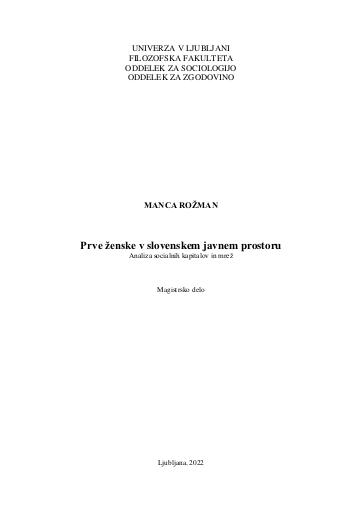 Magistrsko delo z naslovom Prve ženske v slovenskem javnem prostoru: Analiza socialnih kapitalov in mrež s sociološke in zgodovinske perspektive proučuje ženske, ki so v obdobju 1848–1914 v Ljubljani vstopale v polje javnega. Na primeru 54 izbranih žensk, ki so v navedenem obdobju živele v Ljubljani, v nalogi odgovarjam na to, kakšno socialno ozadje so imele, s kom so bile poročene in na kakšne načine so se v javno življenje vključevale. V nalogi se podrobneje ukvarjam s sociološkimi koncepti – (meščanski) habitus in socialni kapital ter socialni razred – s katerimi skušam zamejiti ter prikazati značilnosti družbenega razreda, iz katerega so večinoma prihajale obravnavane ženske. Na podlagi analize več letnikov Slovenskega naroda, popisov ljubljanskega prebivalstva, mednarodne poklicne lestvice HISCLASS ter poročil nekaterih ljubljanskih društev ugotavljam, da so prenekatere posameznice tvorile vezi s takratno ljubljansko elito (kot hčere in žene), obenem pa so se v javnost involvirale tudi kot dejavne kulturnice in umetnice. Pomemben del žensk ljubljanskega družbenopolitičnega dogajanja so predstavljale izobraženke – učiteljice. Izkazalo se je, da jih je nemalo izhajalo iz deprivilegiranih okolij, kar so uspele preseči z izobrazbo ali s poroko. S pomočjo informacij o članstvu v različnih ljubljanskih društvih v nalogi podrobno prikažem dejavnost ljubljanskih žensk, njihova medsebojna poznanstva ter vpletenost njihovih mož in staršev. V nalogi prepletam tudi odnose med spoloma, razmerje med javnim in zasebnim ter vstop žensk v javnost v povezavi z nacionalnim angažmajem slovenskega naroda v obravnavanem obdobju.