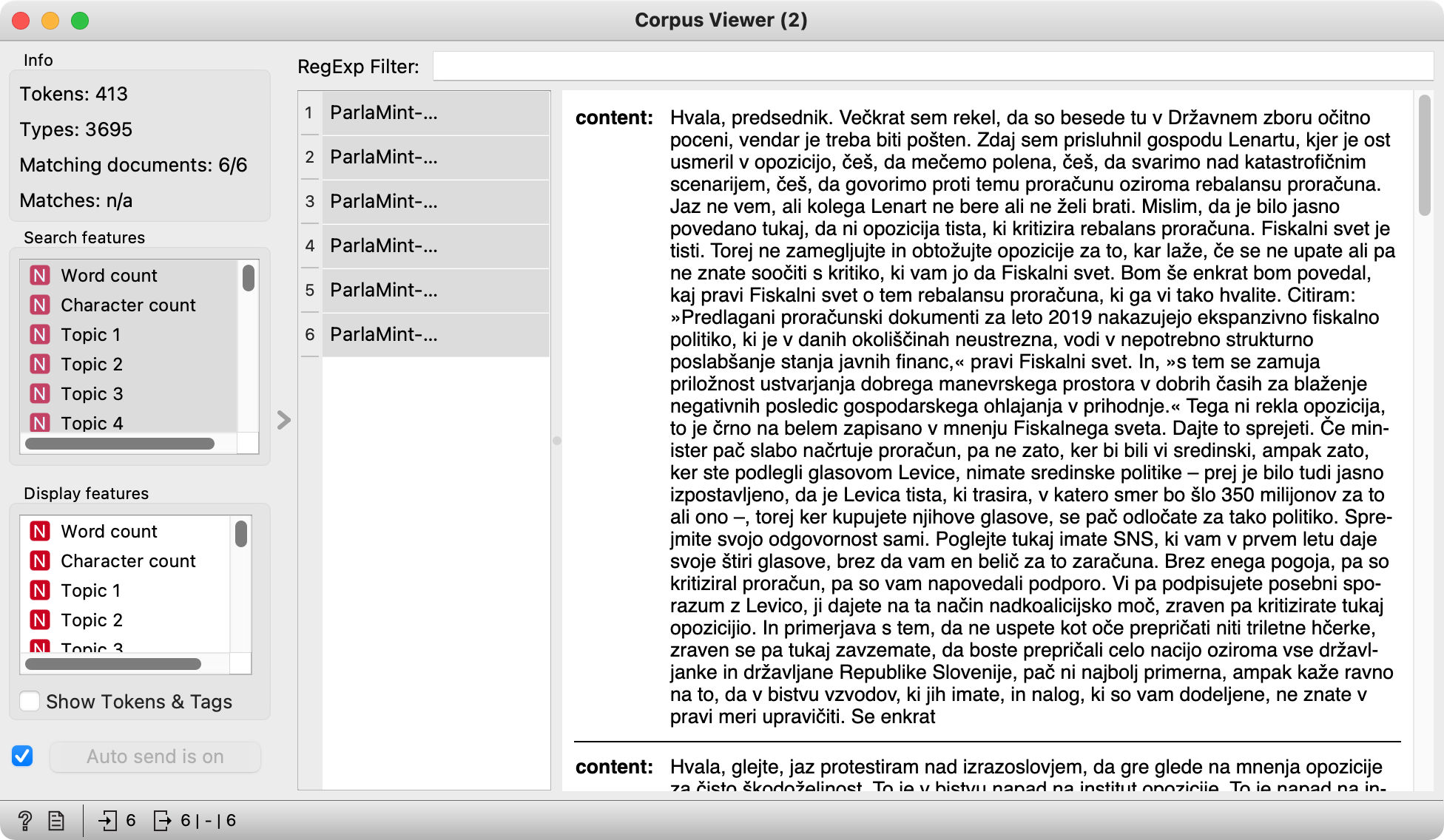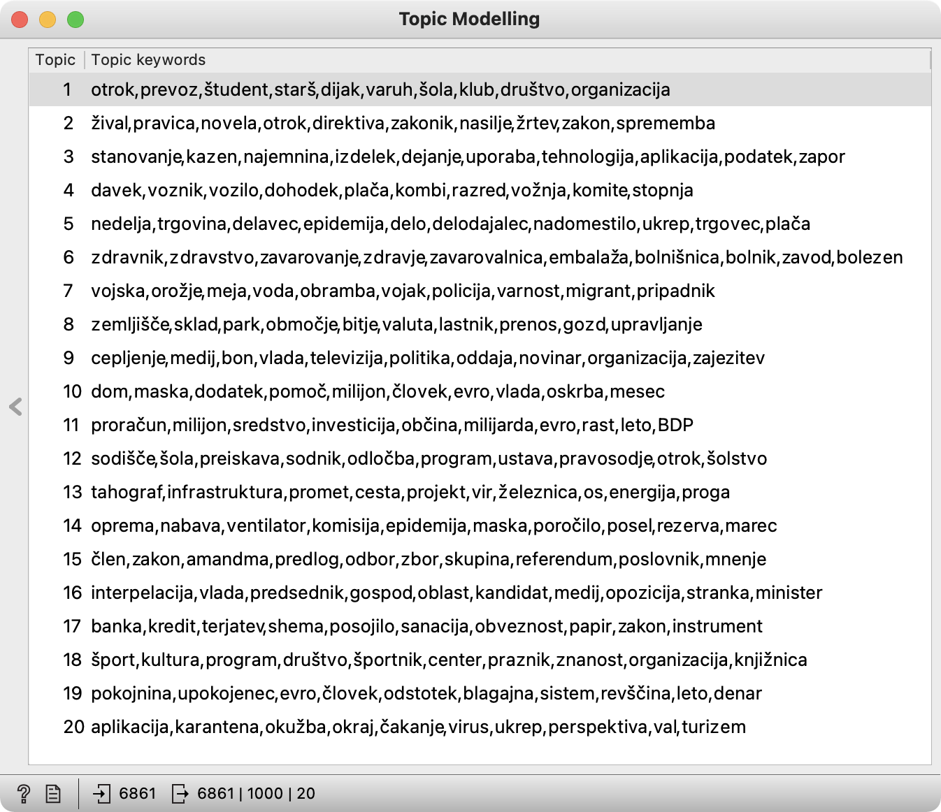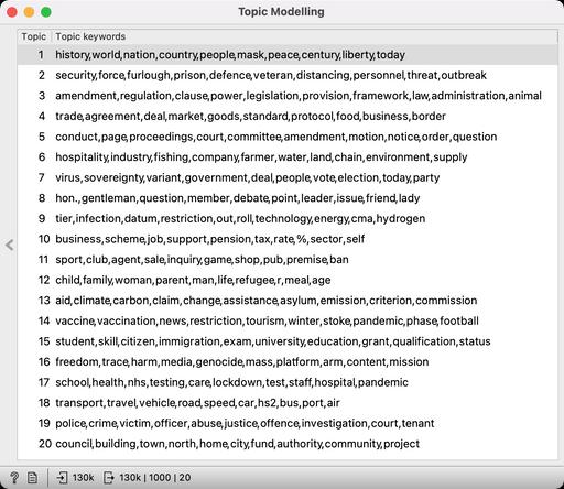 V tem učnem gradivu bomo analizirali zapise parlamentarnih debat ParlaMint, pri čemer bomo uporabili napredne avtomatske analitične tehnike oz. točneje tematsko modeliranje. Namen učnega gradiva je raziskovalke in raziskovalce s področja humanistike in družboslovja vpeljati v svet rudarjenja besedil ter prikazati vrednost tovrstnih pristopov za družboslovne in humanistične raziskave. Učno gradivo razlaga posebnosti parlamentarnega diskurza in uporabo tematskega modeliranja za reševanje konkretnih raziskovalnih vprašanj.